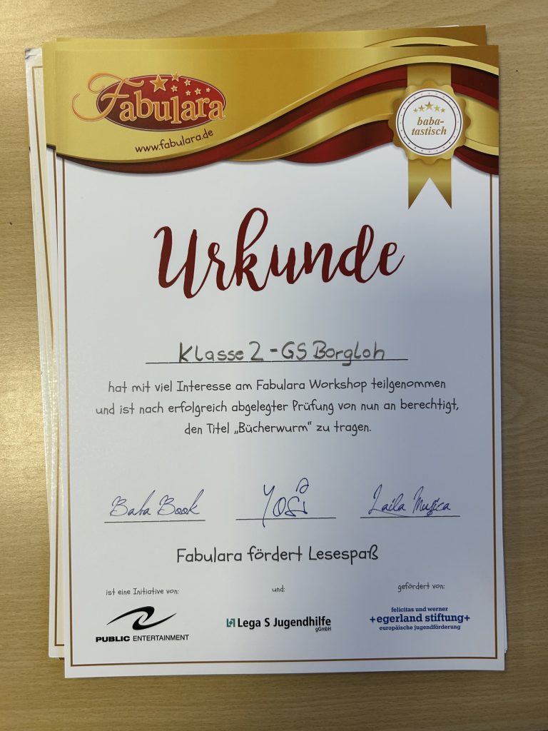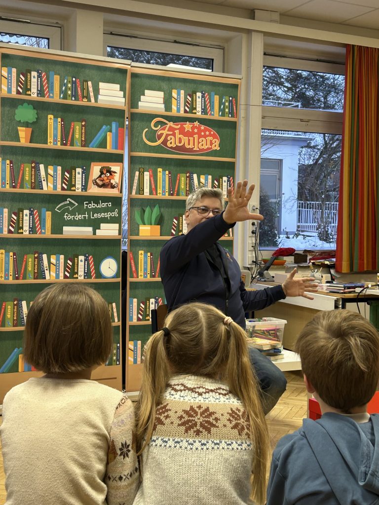 Im Dezember war es soweit: Das Leseprojekt Fabulara startete für die 1. und 2.Klasse im Turnhallenanbau unserer Schule, wo eine Bühne umrahmt von großen Bücherschränken aufgebaut war.